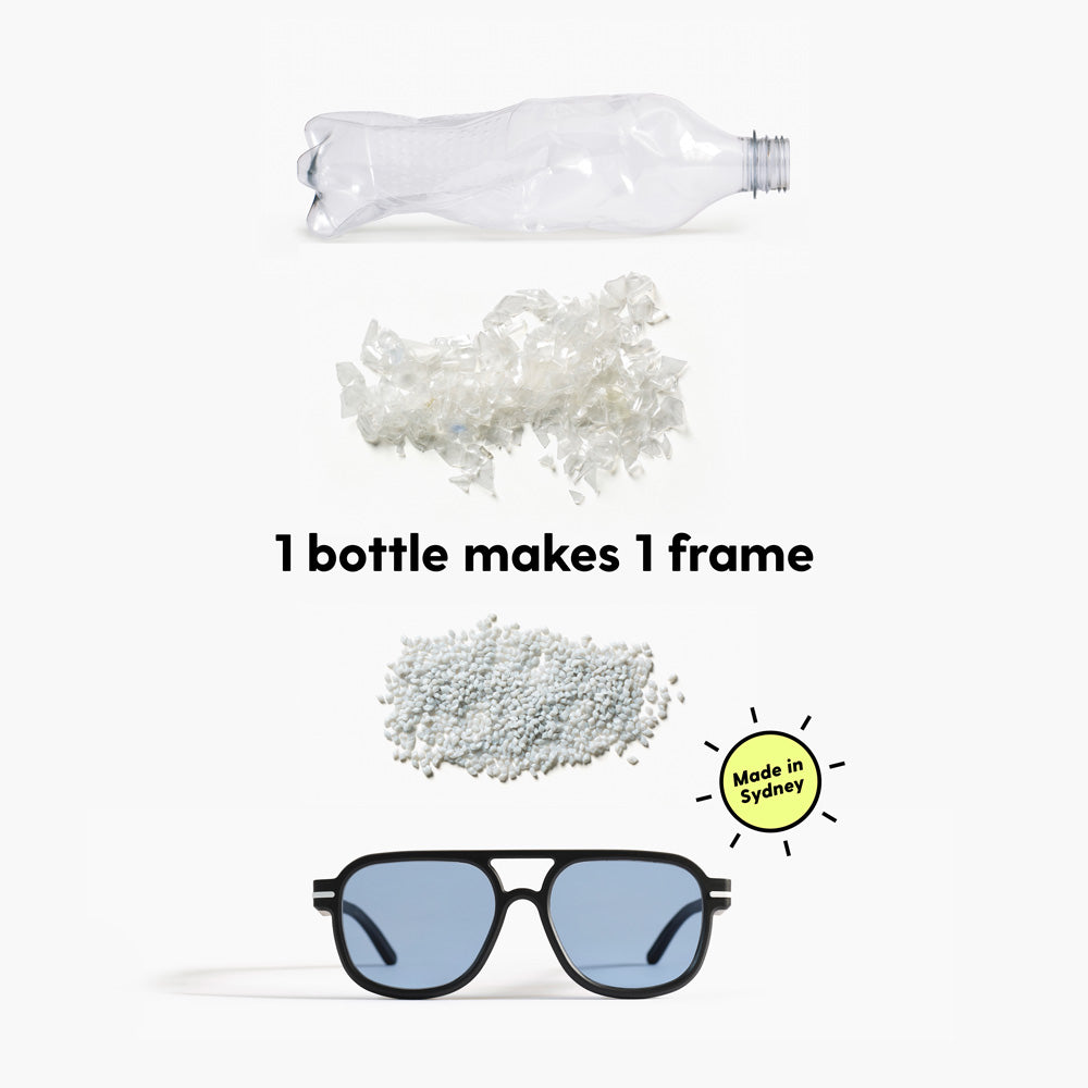 1. Our 100% recycled bottle plastic is processed and turned into your frames in Sydney, so everyone gets a fair wage.